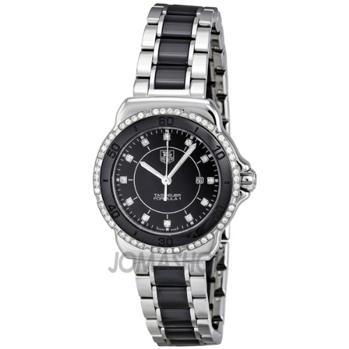 Stainless steel case with a steel bracelet with black ceramic center links. Fixed steel and black ceramic bezel set with 48 diamonds. Black dial with silver-tone hands and diamond hour markers. Minute markers around the outer rim. Dial Type: Analog. Luminescent hands and markers. Date display at the 3 o'clock position. Quartz movement. Scratch resistant sapphire crystal. Screw down crown. Solid case back. Case diameter: 32mm. Deployment clasp with push button release. Water resistant at 200 meters / 660 feet. Functions: date, hour, minute, second. Sport watch style. Watch label: Swiss Made. Tag Heuer Formula 1 Black Dial Steel and Ceramic Ladies Watch WAH1312.BA0867.